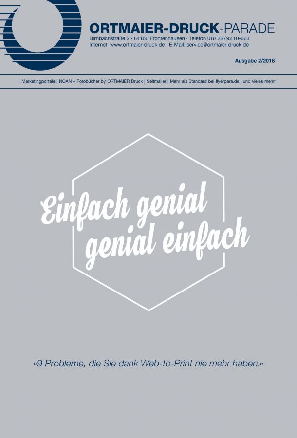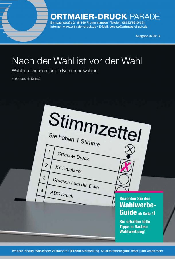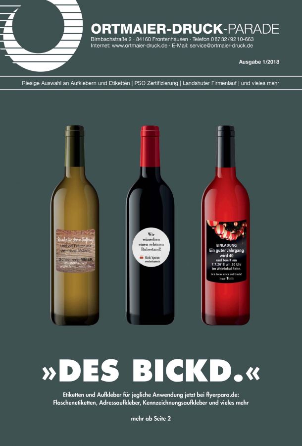 ORTMAIER Druck ist ein mittelständisches, familiengeführtes Unternehmen mit Sitz in Frontenhausen im Landkreis Dingolfing-Landau. In diesem ländlichen Raum, der Aufsteigerregion Bayerns, bietet unser Unternehmen mit über 140 Mitarbeitern das volle Sortiment in Sachen Druck. Dazu kommen individueller Service und ein attraktives Preis-Leistungs-Verhältnis in einem modernen Umfeld. Auf über 4000 Quadratmetern Produktionsfläche ist unsere Firma Vollsortimenter vom Kleinstauftrag bis hin zur Großauflage. Alles, was beschriftet oder bedruckt werden kann, bekommt der Kunde aus einer Hand und mit hohem Qualitätsstandard.